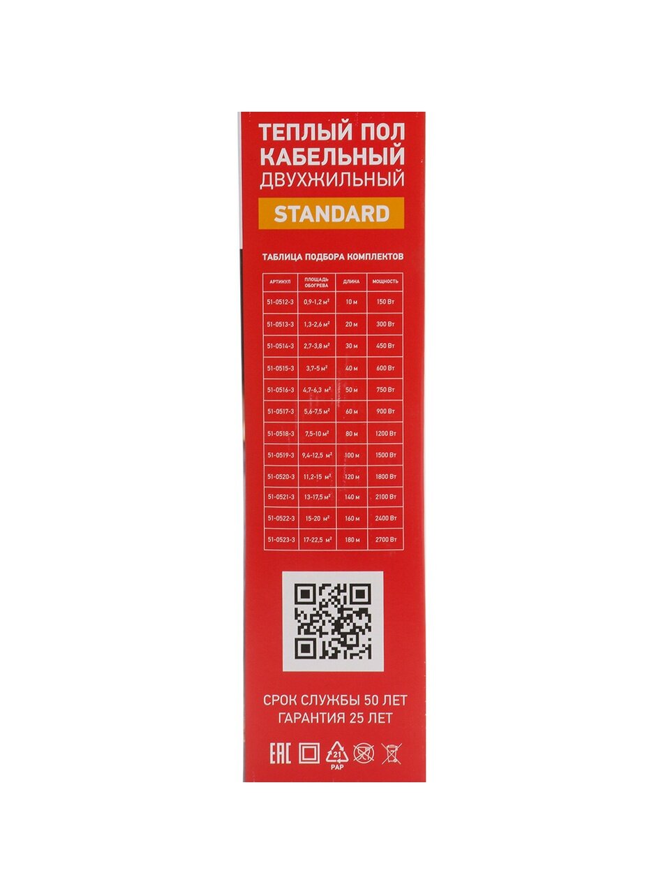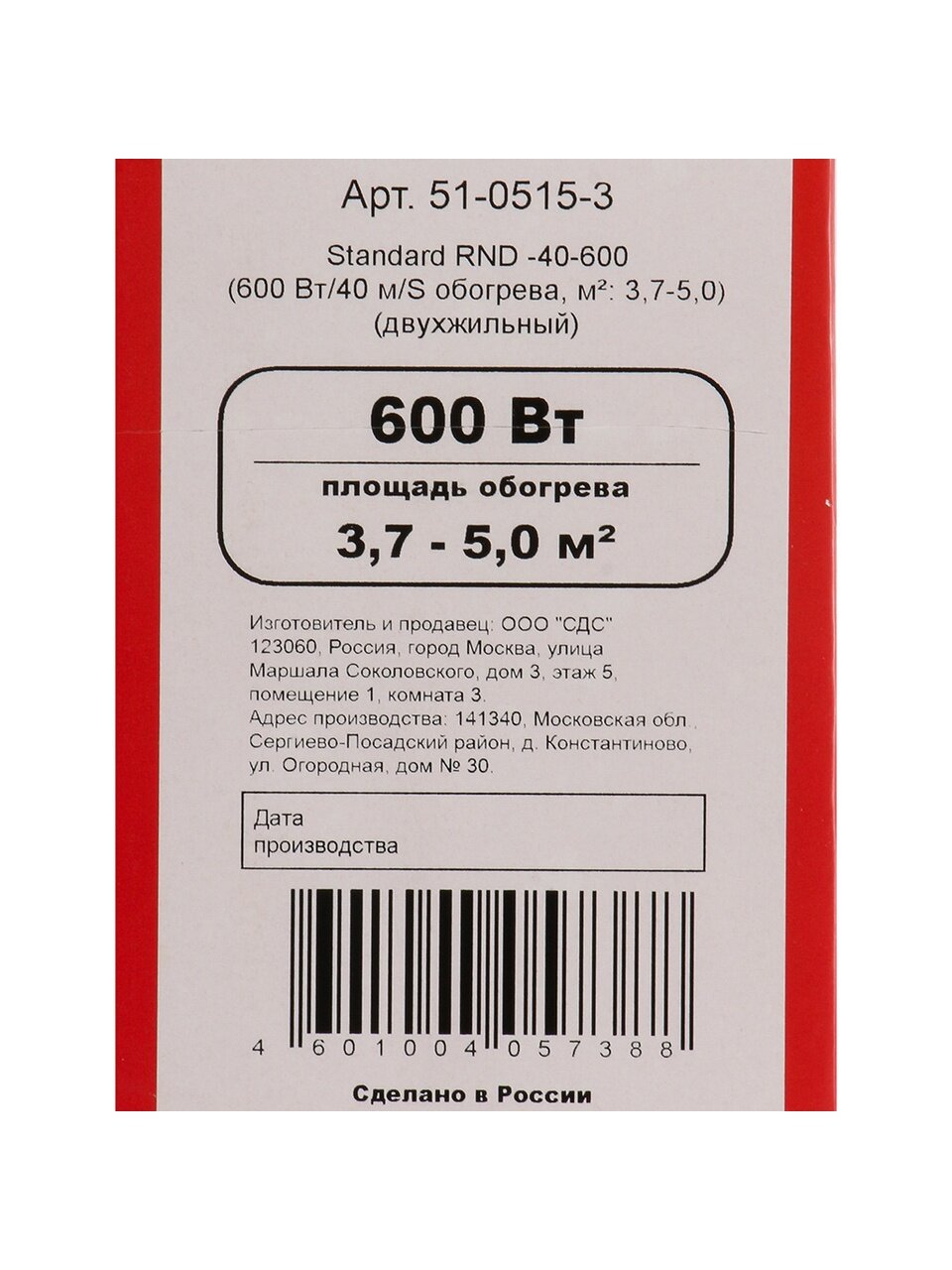 Тёплый пол Rexant Standard RND-40-600: эффективный обогрев 3.7–5.0 м², двухжильный кабель 40 м, надёжность IP67 — комфорт и экономия под любым покрытием.