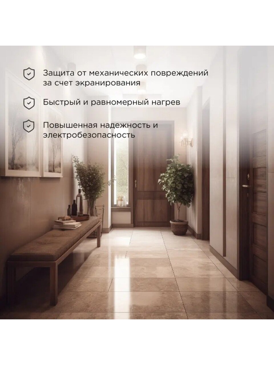 - Оптимальная длина 40 м, мощность 600 Вт, защита IP67: подходит для любых типов напольных покрытий, от плитки до ламината.