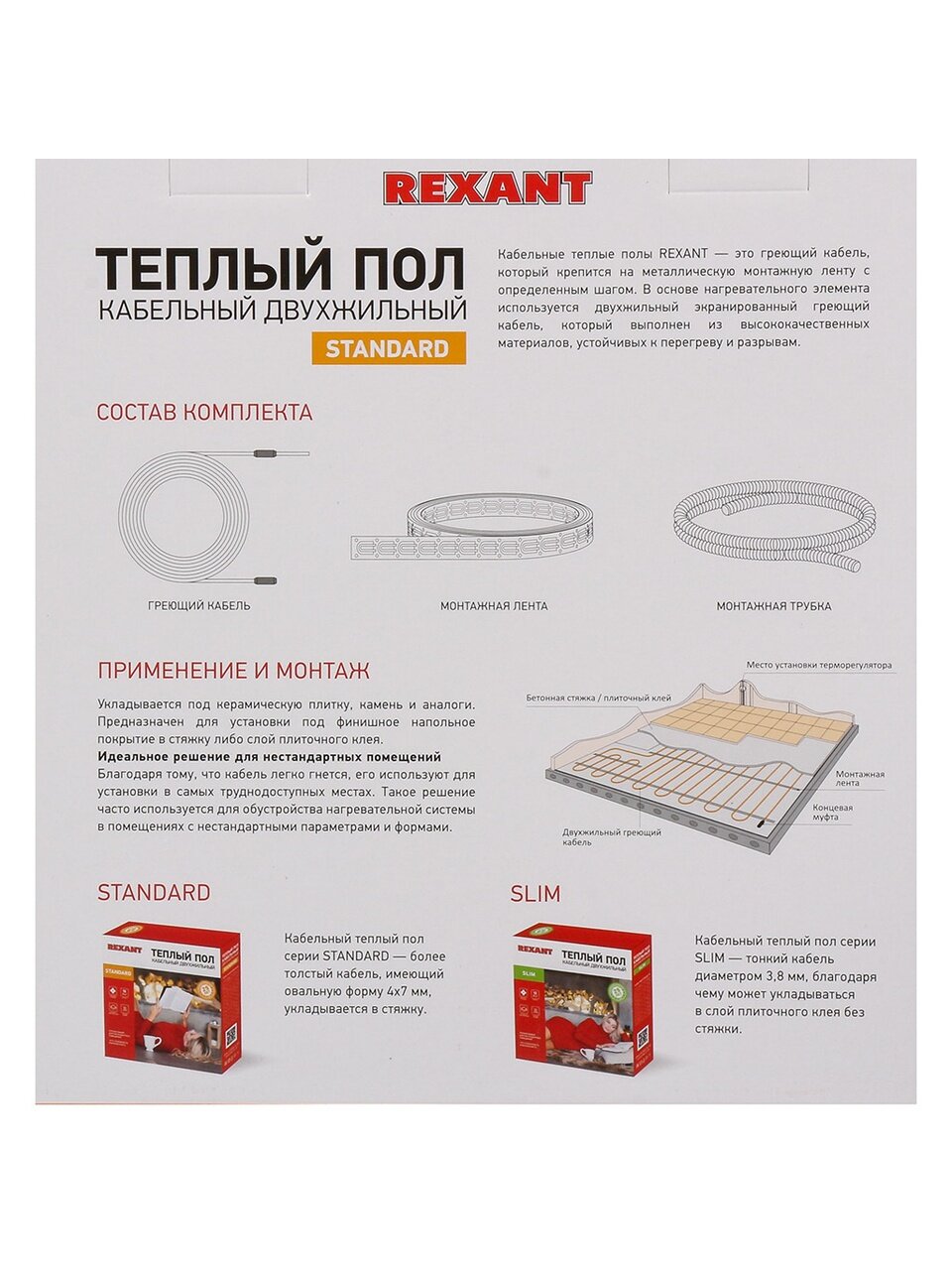 В отличие от пленочных или одножильных систем, Rexant Standard RND-60-900 обеспечивает стабильную работу и долговечность (ресурс — более 20 лет при правильном монтаже). Это выгодное вложение для комфортного микроклимата круглый год.