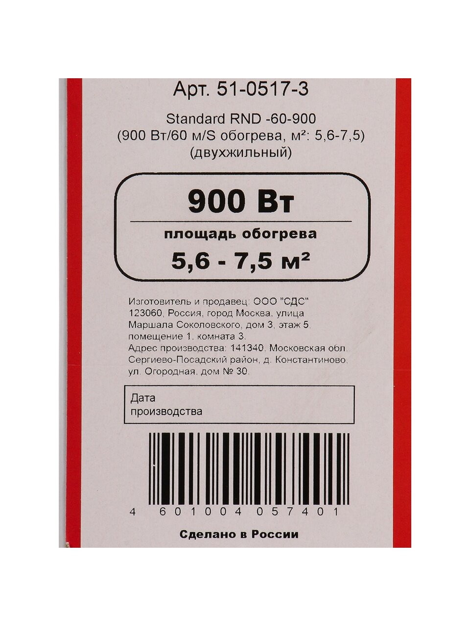 Модель Standard RND-60-900 рассчитана на площадь 5.6–7.5 м², длина кабеля — 60 м, мощность — 900 Вт, тепловыделение — 15 Вт/м. Подходит для стандартных комнат, санузлов, балконов, кухни.