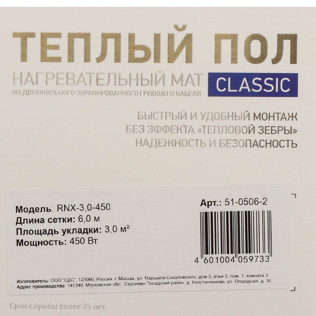 Тёплый пол Rexant Classic RNX-3-450: оптимальное решение для обогрева 3 м², 450 Вт, монтаж под плитку или стяжку, IP67 — комфорт круглый год.