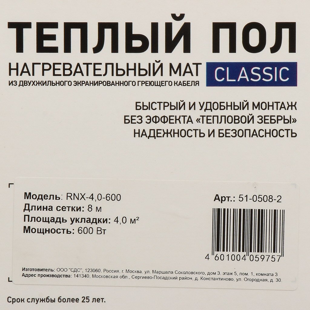 Теплый пол 4 м2 Rexant Classic RNX-4-600 — быстрый монтаж, экономия на отоплении и комфорт для всей семьи. Идеально для квартиры, дачи или офиса.