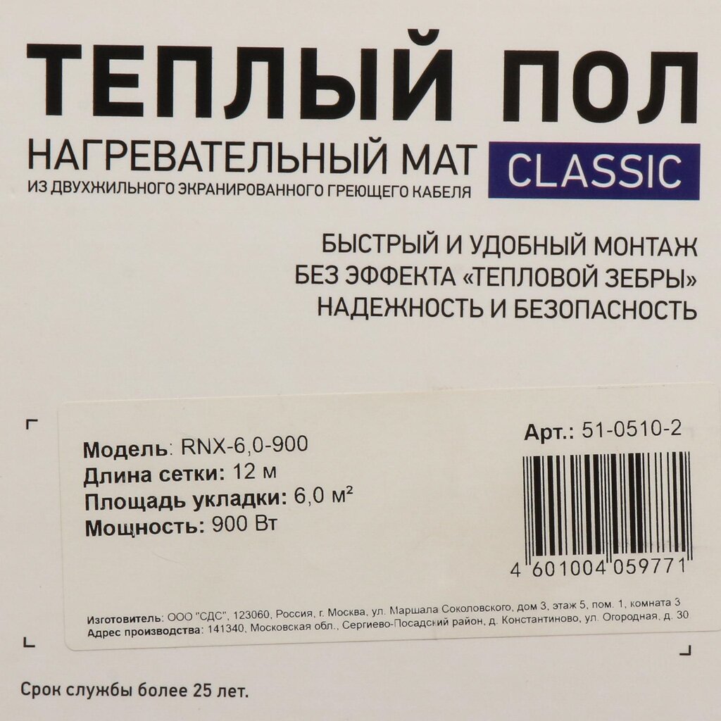 Теплый пол 6 м2 Rexant Classic RNX-6-900: комфорт и экономия — идеальное решение для квартиры, дома или дачи. Гарантия безопасности и простоты монтажа.