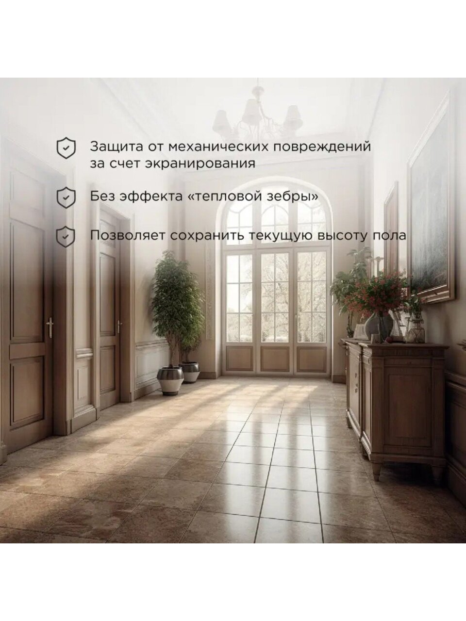 Если вы ищете, какой теплый пол выбрать для кухни, ванной или гостиной, обратите внимание на этот мат: он легко монтируется под цементно-песчаную стяжку (20 мм) или слой плиточного клея (5-7 мм), не поднимая уровень пола. Защита IP67 позволяет использовать систему в помещениях с повышенной влажностью. В отличие от аналогов без экрана, этот теплый пол безопаснее и долговечнее, а двухжильная конструкция снижает электромагнитные помехи. Подходит ли для дачи? Да, система устойчива к перепадам температуры и влажности, что делает её универсальной для разных сценариев использования.