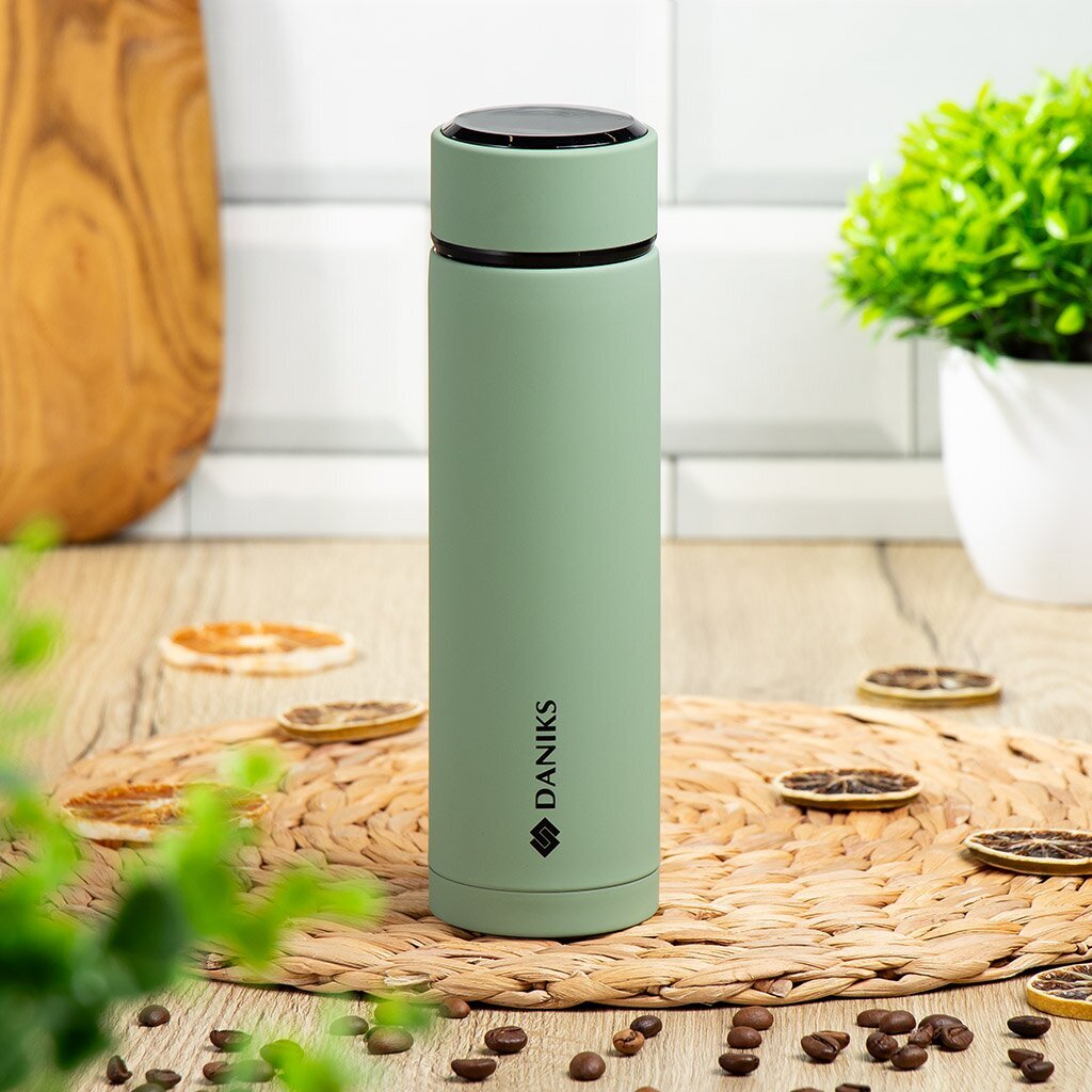 Стильный и функциональный термос Daniks сохраняет температуру до 24 часов. Проконтролировать ее Вы можете с помощью специального датчика, установленного на крышке. Такой термос удобно брать с собой на природу, прогулку или работу.