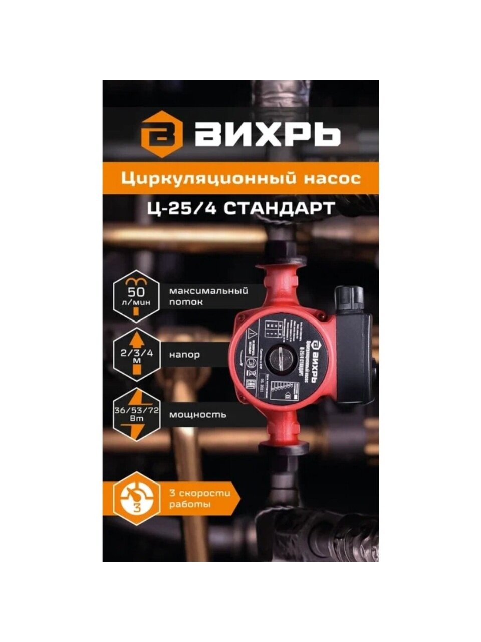 Циркуляционный насос ВИХРЬ ЦН-25-4 предназначен для обеспечения циркуляции воды в системах отопления, круговых трубопроводах горячего и холодного водоснабжения, центральных отопительных установках и системах перекачки промышленных вод (системах кондиционирования, охлаждения). Насос представляет собой компактное устройство с всасывающей и нагнетающей функциями. Вода перекачивается при помощи вращения рабочего колеса электродвигателем насоса. Данный вид насосов надёжен, экономичен и прост в использовании.