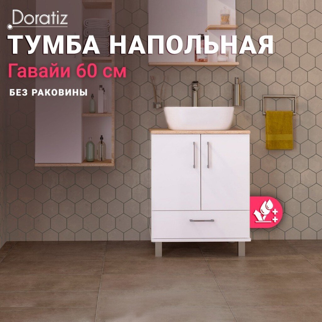 Покупка тумбы Doratiz, Гавайи, Venera 60 – это выгодное вложение, которое не только украсит ванную комнату, но и обеспечит удобство в повседневной жизни. Благодаря высокому качеству материалов и продуманному дизайну, тумба прослужит долго, сохраняя первозданный вид. Воспользуйтесь возможностью приобрести стильный и практичный элемент интерьера, который подчеркнет индивидуальность и вкус.