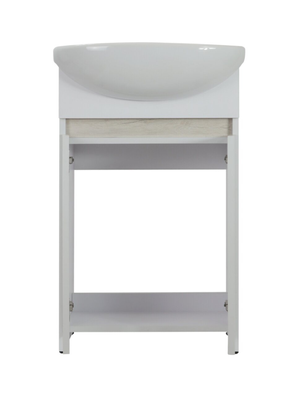 Тумба изготовлена из современных влагостойких материалов с отделкой под светлый дуб и белый цвет. В комплекте — напольная тумба с двумя ящиками, готовая к установке под умывальник Браво 50.
