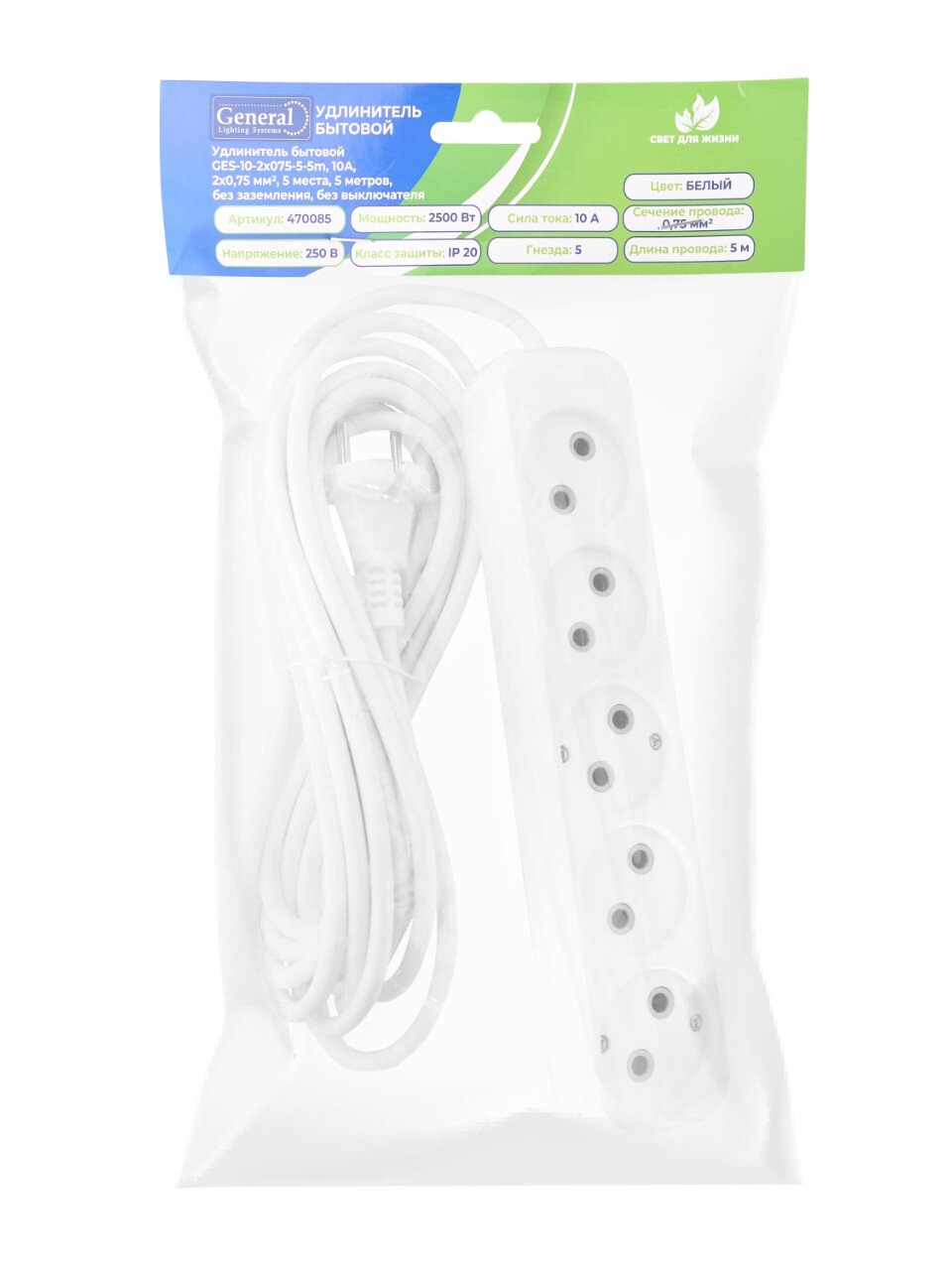 Вы можете приобрести «Удлинитель бытовой 5 гнезд, 5 м, ПВС, 2х0.75 мм², без заземления, 10 А, 2200 Вт, General Lighting Systems, 470085» и другие товары в нашем интернет-магазине в Ельце по низким ценам и с бесплатным самовывозом.