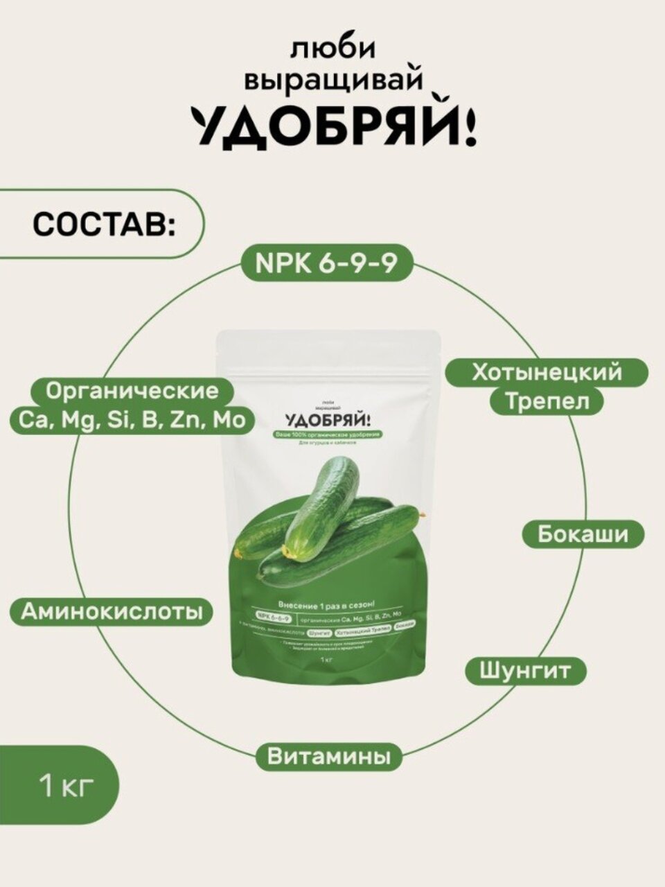 Удобрение для огурцов и кабачков «Удобряй!», 1 кг — быстрый рост, устойчивость к болезням, урожай до 30% выше. Для дачи и теплицы, экономия на каждом килограмме!