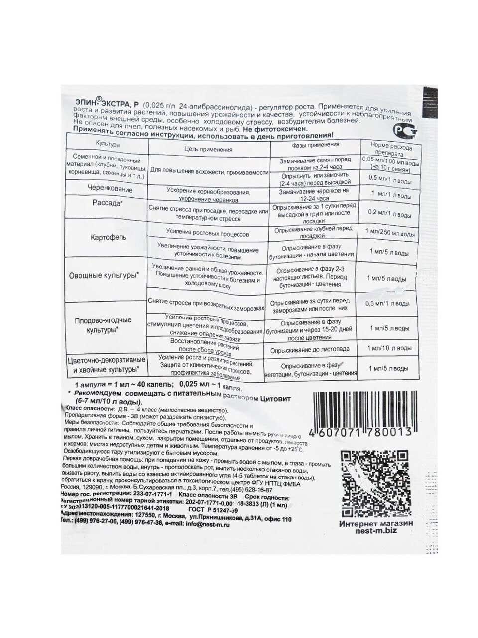 Регулятор роста «ЭПИН-Экстра» – уникальное средство широкого спектра действия. Он повышает стрессоустойчивость растений и способность быстро адаптироваться к изменения в окружающей среде, защищает от болезней и заморозков, восстанавливает повреждения, стимулирует рост и улучшает урожайность. Это средство можно купить для обработки семян овощных и злаковых культур перед посадкой, а также для опрыскивания в разные фазы роста растений.