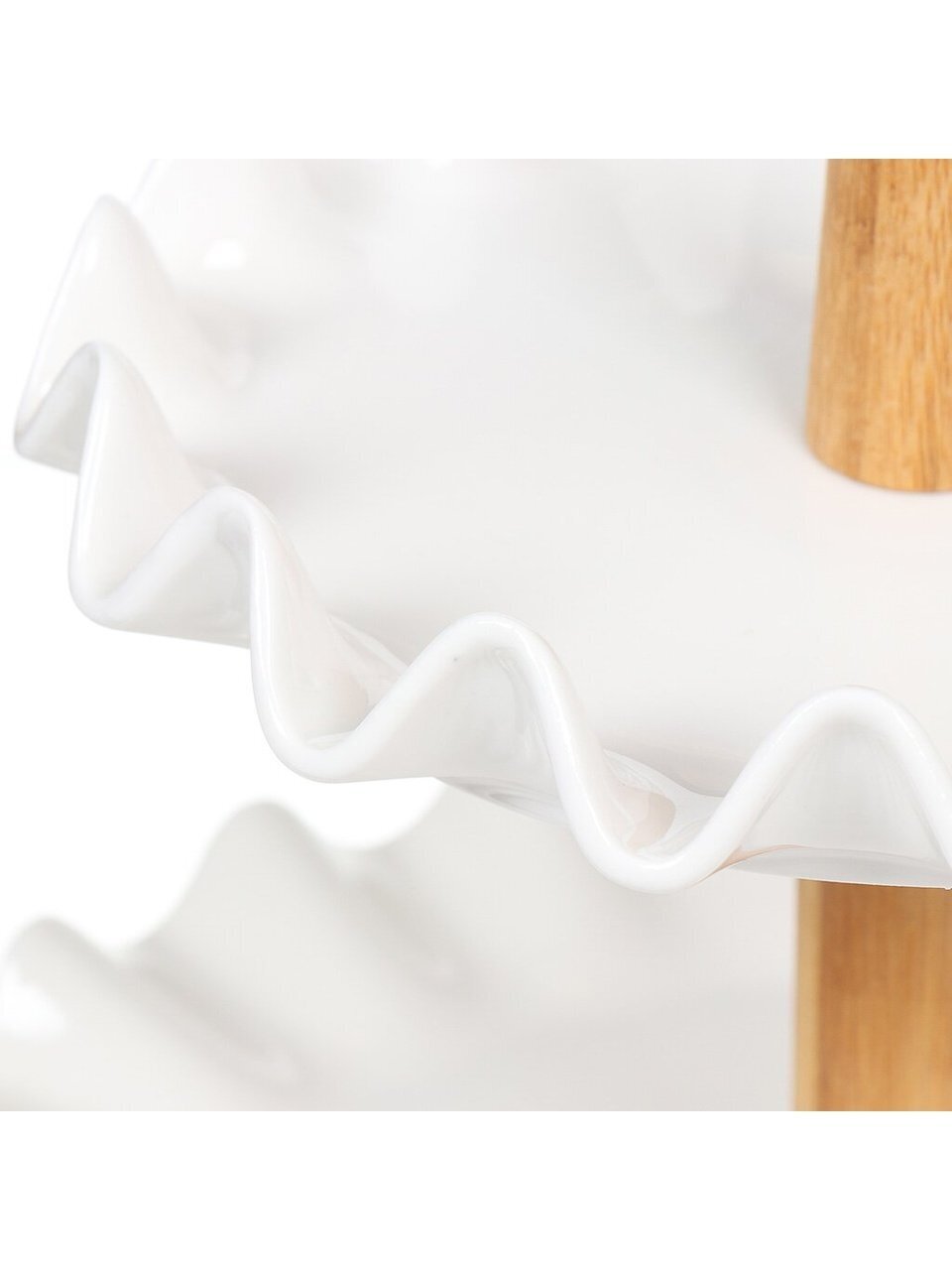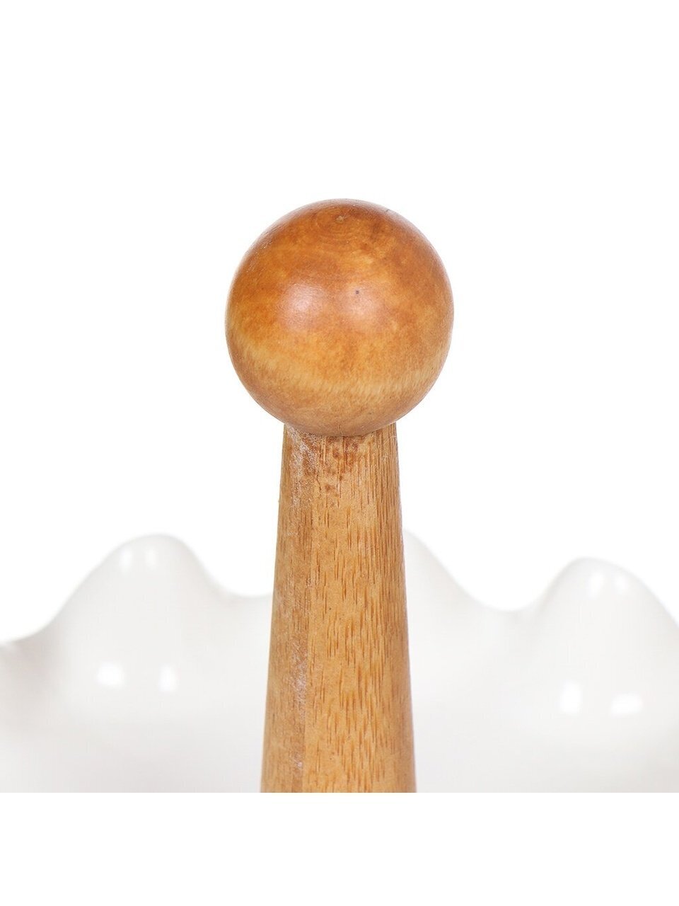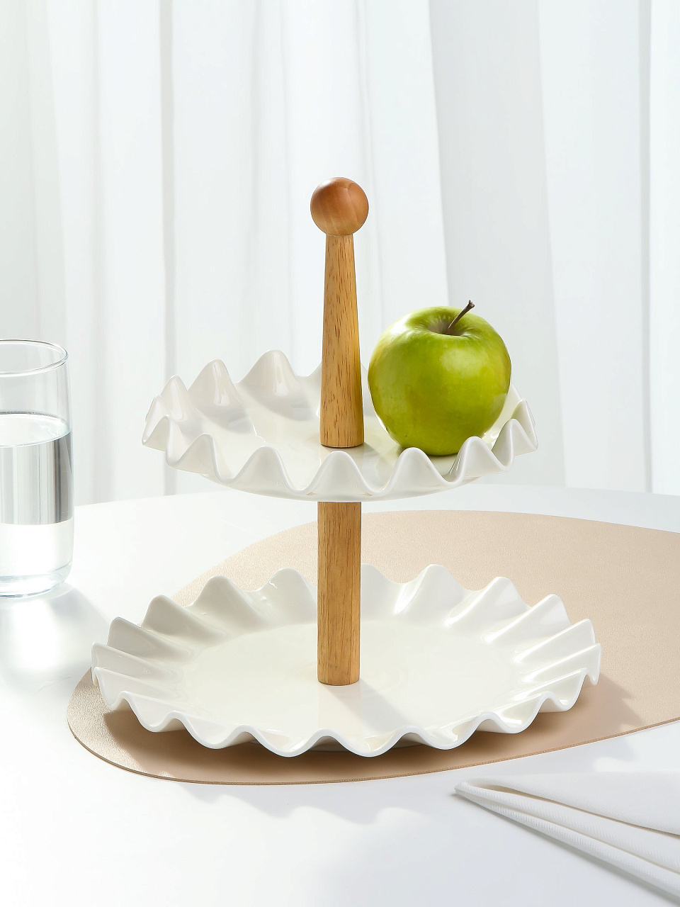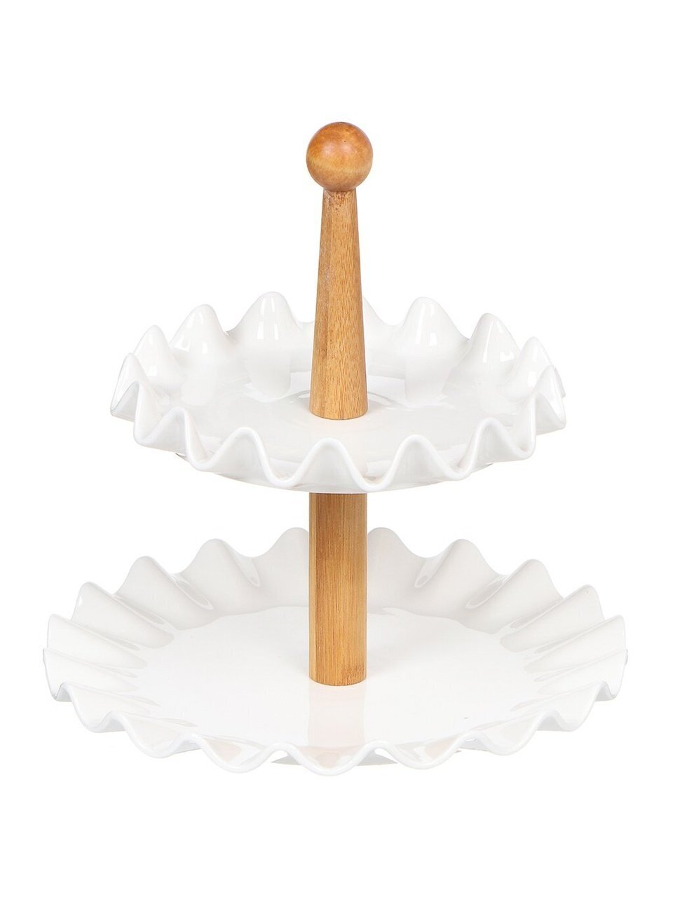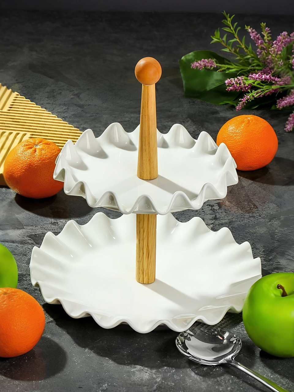 Двухъярусная фруктовница выполнена из керамики в виде двух блюд на деревянной ножке. Фруктовница станет идеальным украшением любой кухни или прекрасным подарком для вас и ваших близких.