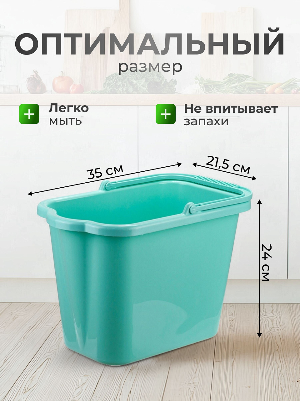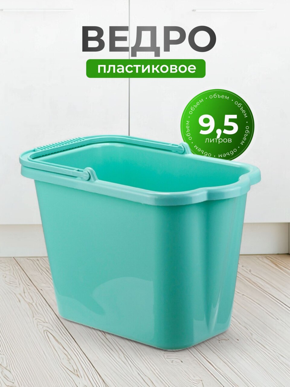 Ведро пластиковое хозяйственное 9.5 л в стильном аквамариновом цвете — идеальный выбор для дома и дачи. Прочный пластик обеспечивает долговечность, а удобный сливной носик облегчает выливание жидкости. Прямоугольная форма экономит место хранения. Размер по верху: 21.5x35 см. Размер дна: 14.5x26 см.