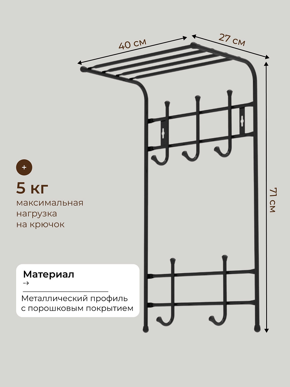 Часто спрашивают, чем отличается эта вешалка от аналогов? В отличие от пластиковых моделей, металл обеспечивает высокую прочность и устойчивость к повреждениям. Черное порошковое покрытие делает изделие менее марким и подчеркивает современный стиль. Вешалка подходит для крепления на разные типы стен — гипсокартон, бетон или дерево. Как использовать настенную вешалку с полкой? Просто закрепите на удобной высоте и используйте для хранения сезонных вещей или аксессуаров.