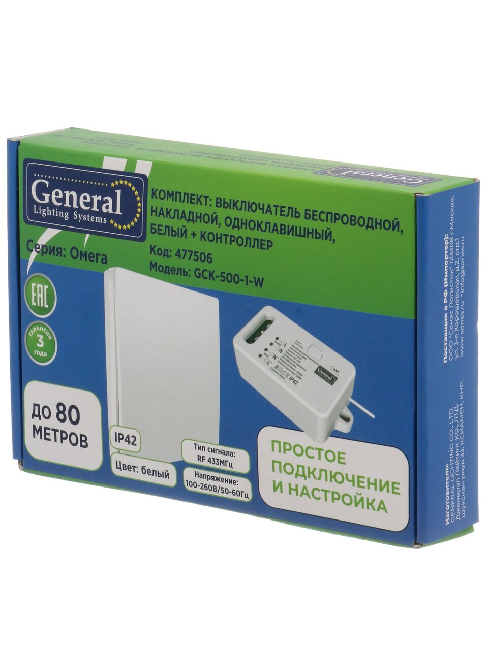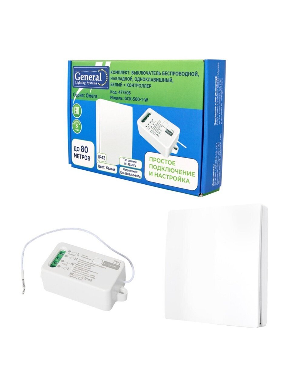 Комплект открытой установки General Lighting Systems Омега: беспроводной одноклавишный выключатель и контроллер 500Вт — быстрое решение для удобного управления светом дома и на даче.