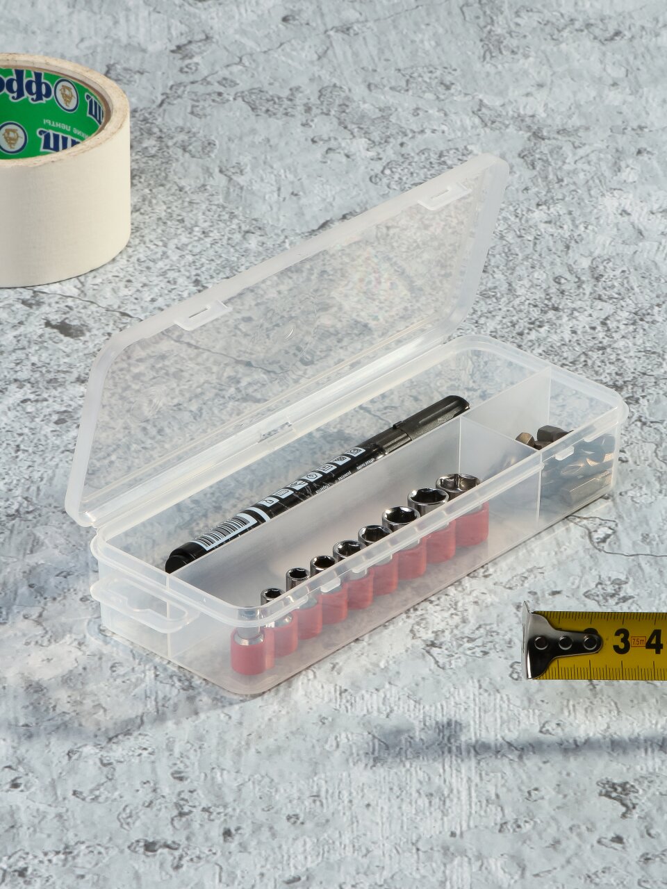 - Устойчивый пластиковый корпус 20х8х3.5 см — оптимальный размер для ручного инструмента, мелочей, крепежа