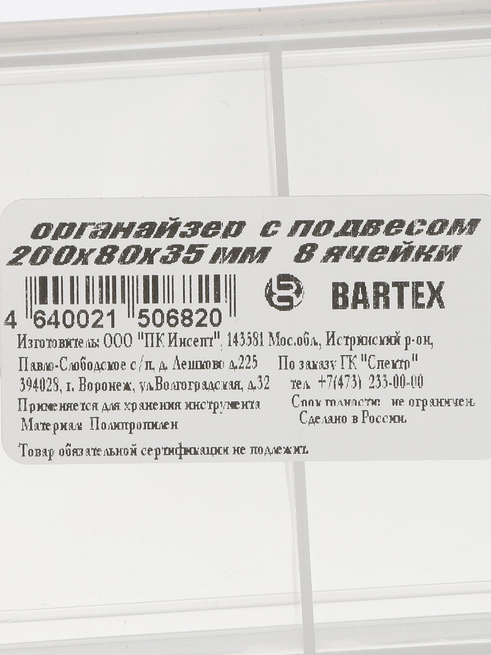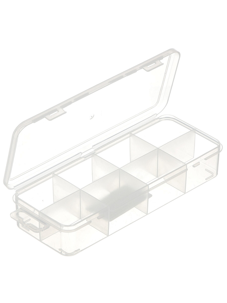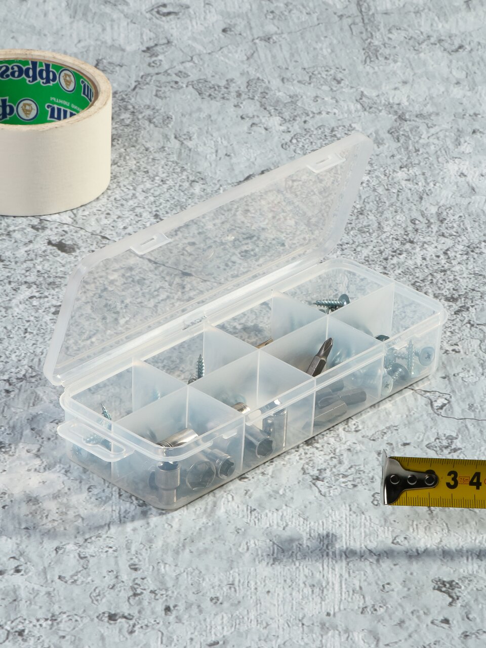 Ящик-органайзер Bartex 8 ячеек — компактное решение 20×8×3.5 см для хранения инструмента дома и на даче, с подвесом для удобства и прозрачным корпусом.