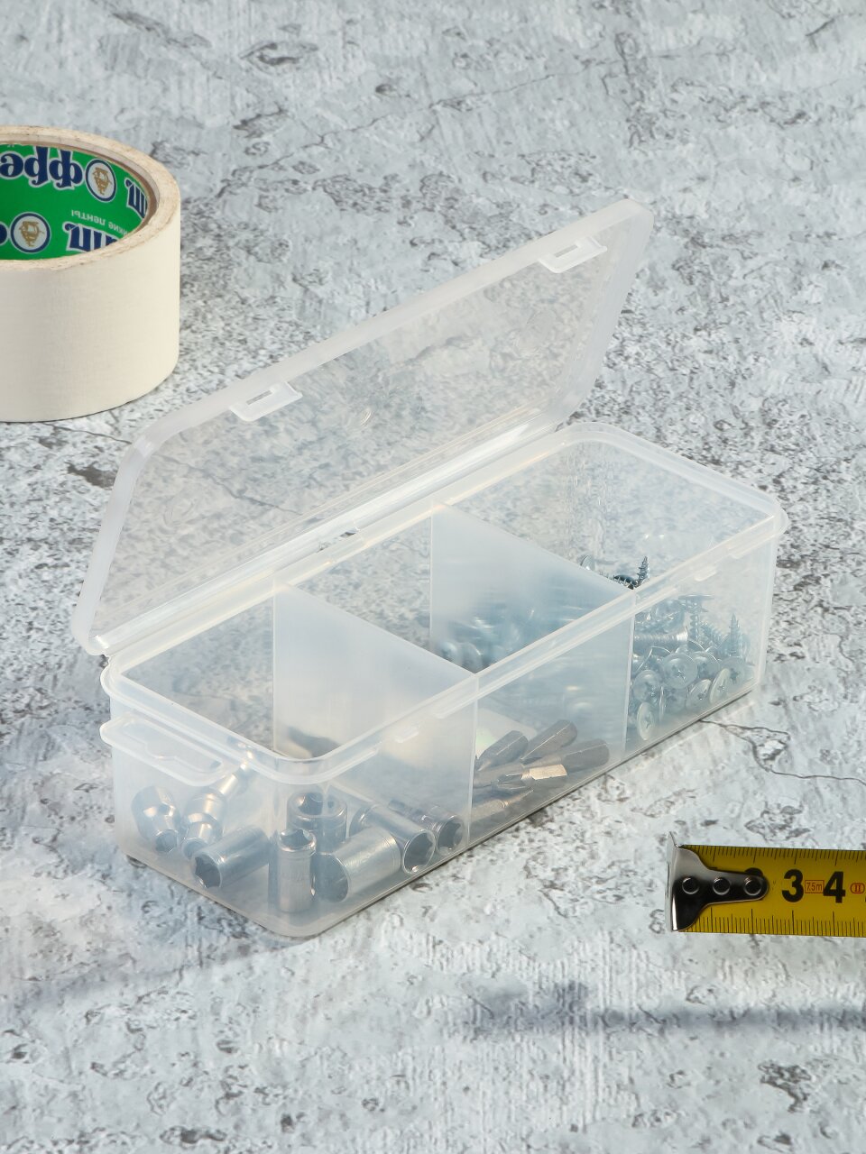 Размер — 20х8х5.5 см, три секции. Идеален для хранения мелких инструментов, фурнитуры, аксессуаров для хобби, швейных и канцелярских принадлежностей.