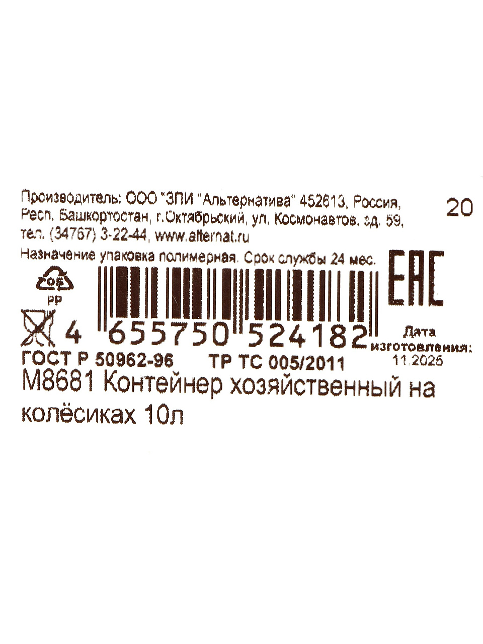 Вы можете приобрести «Контейнер хозяйственный 10 л, 46.5х16.5х25.5 см, на колесиках, Альтернатива, М8681» и другие товары в нашем интернет-магазине в Астрахани по низким ценам и с бесплатным самовывозом.