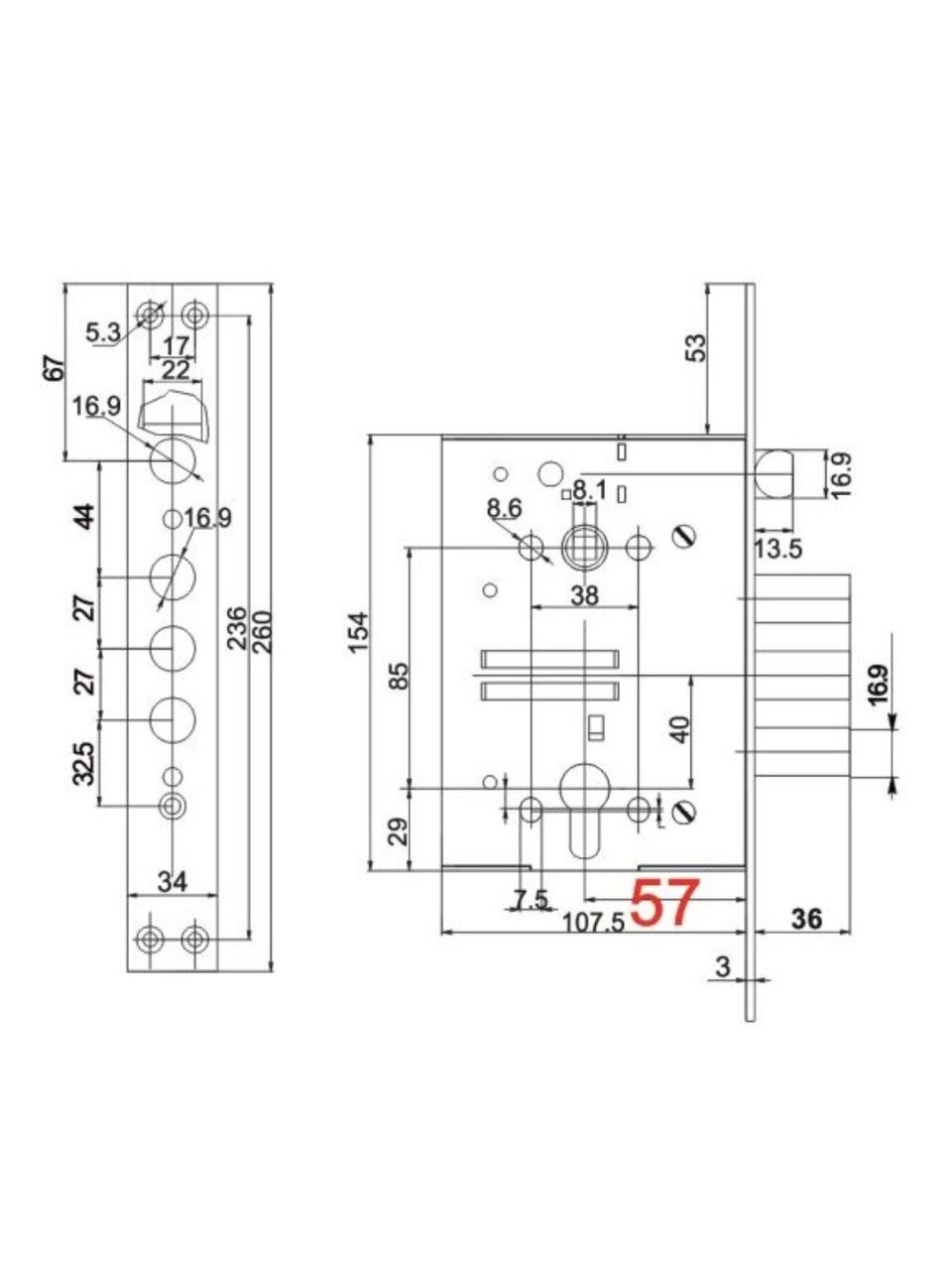 - Удаление ключевого отверстия: 57 мм.