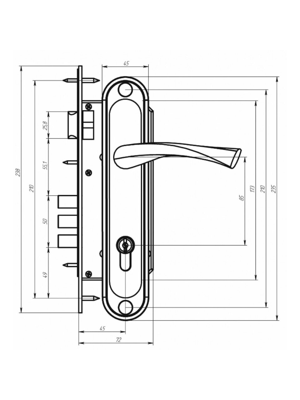 - Материальное исполнение: Корпус, засов - сталь, Защелка - сплав цинковый, Ручки - сплав алюминиевый, Накладки - сталь