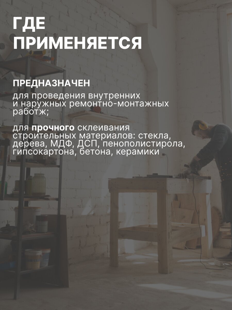 Универсальный водостойкий клей предназначен для проведения внутренних и наружных ремонтно-монтажных работ, для прочного склеивания строительных материалов: стекла, дерева, МДФ, ДСП, пенополистирола, гипсокартона, бетона, керамики и других подобных материалов.