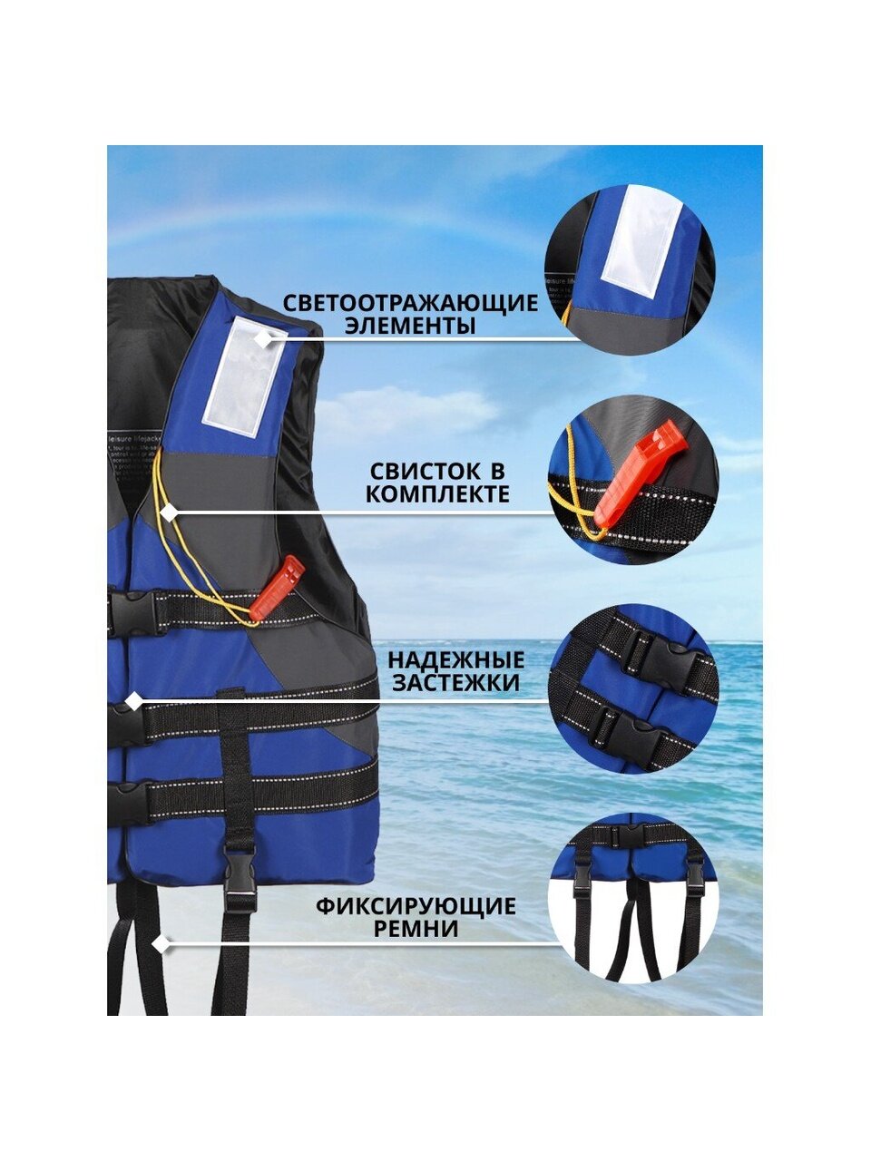- Надежные фиксирующие ремни, предотвращающие возможность выскальзывания из жилета.